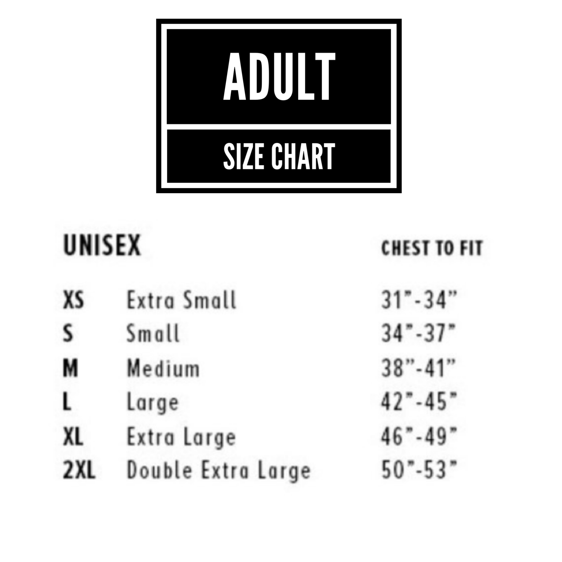 Fits true to size. Unisex sizing. We recommend ordering the same size you normally wear in an adult unisex shirt. If you want more of a fitted look, order one size down. Refer to Product Images for Size Chart with chest measurements.