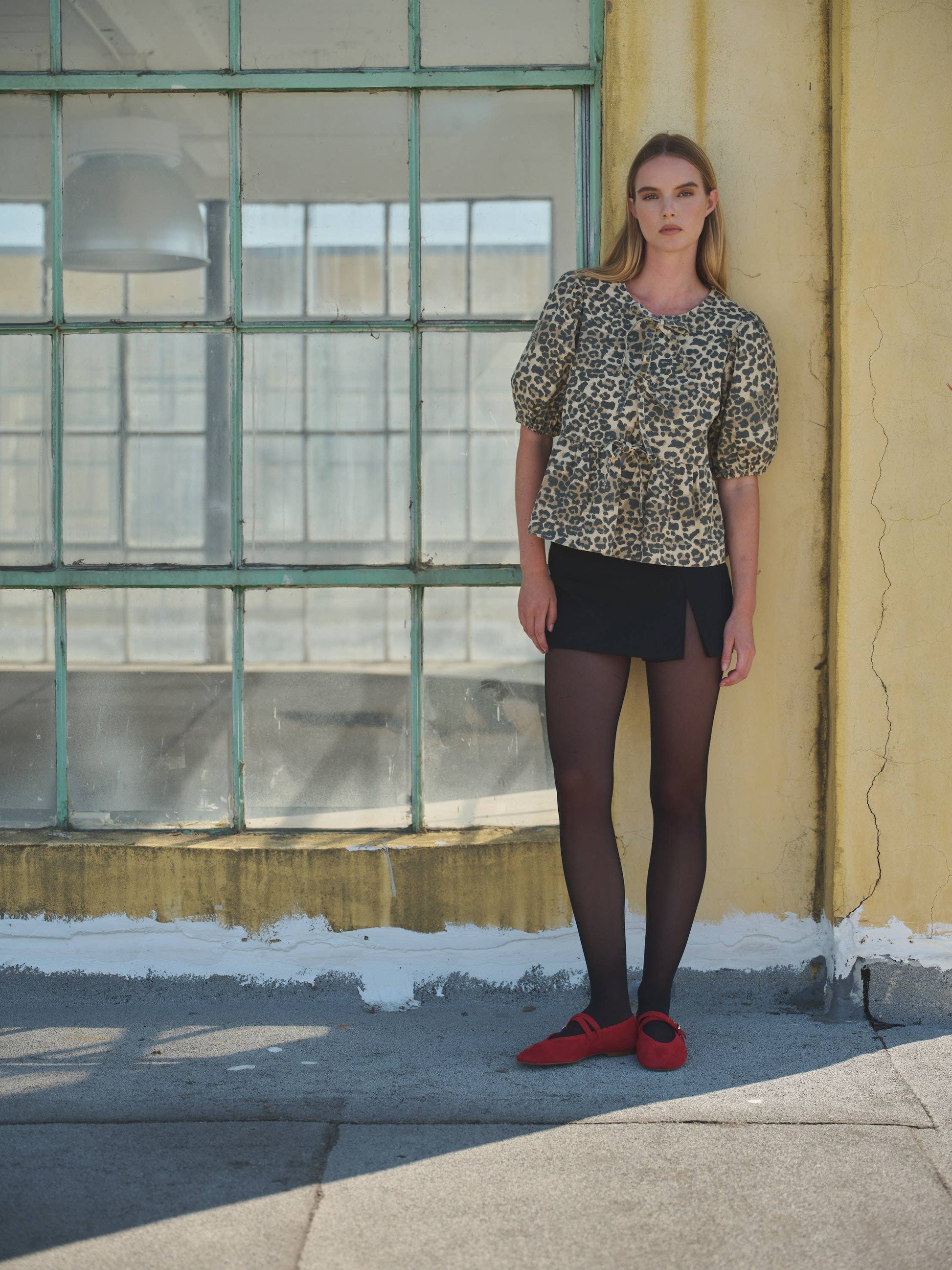 This animal print bow tie blouse offers a signature puff sleeves with elastic edges, adding a touch of volume and sophistication. The bow tie closures elevate the overall look, making it both distinctive and elegant. The blouse is designed for a relaxed fit and features an open round neckline