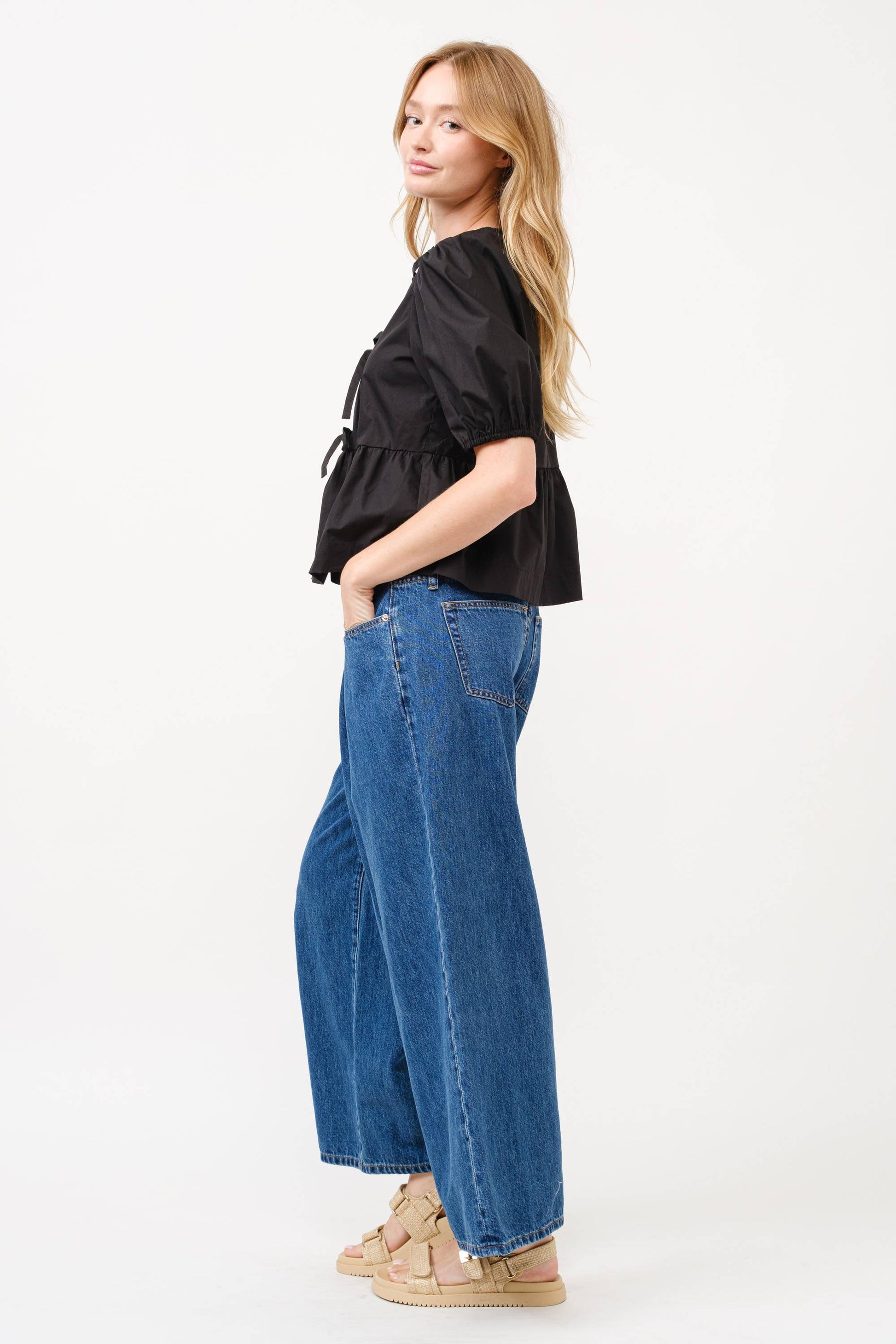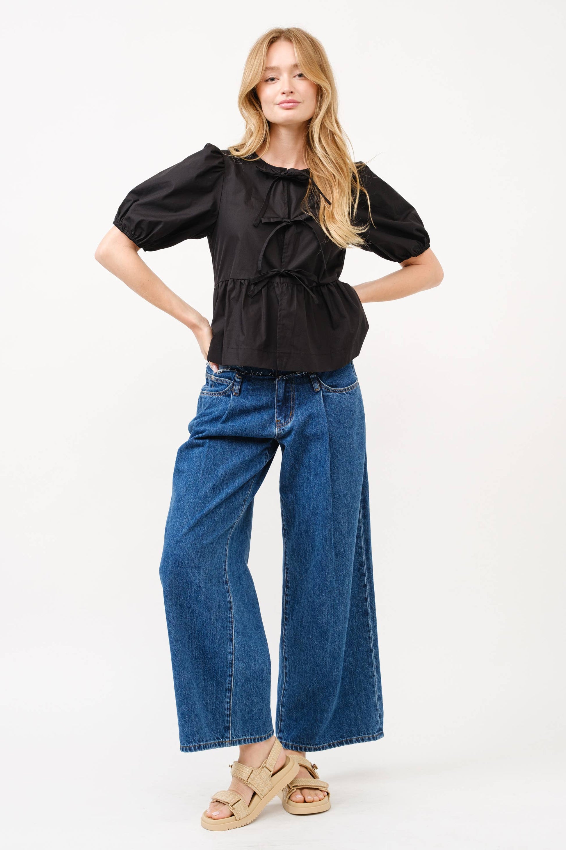 MAT2803 - POPLIN FRONT BOW TIE PEPLUM BLOUSE WITH PUFF SLEEV