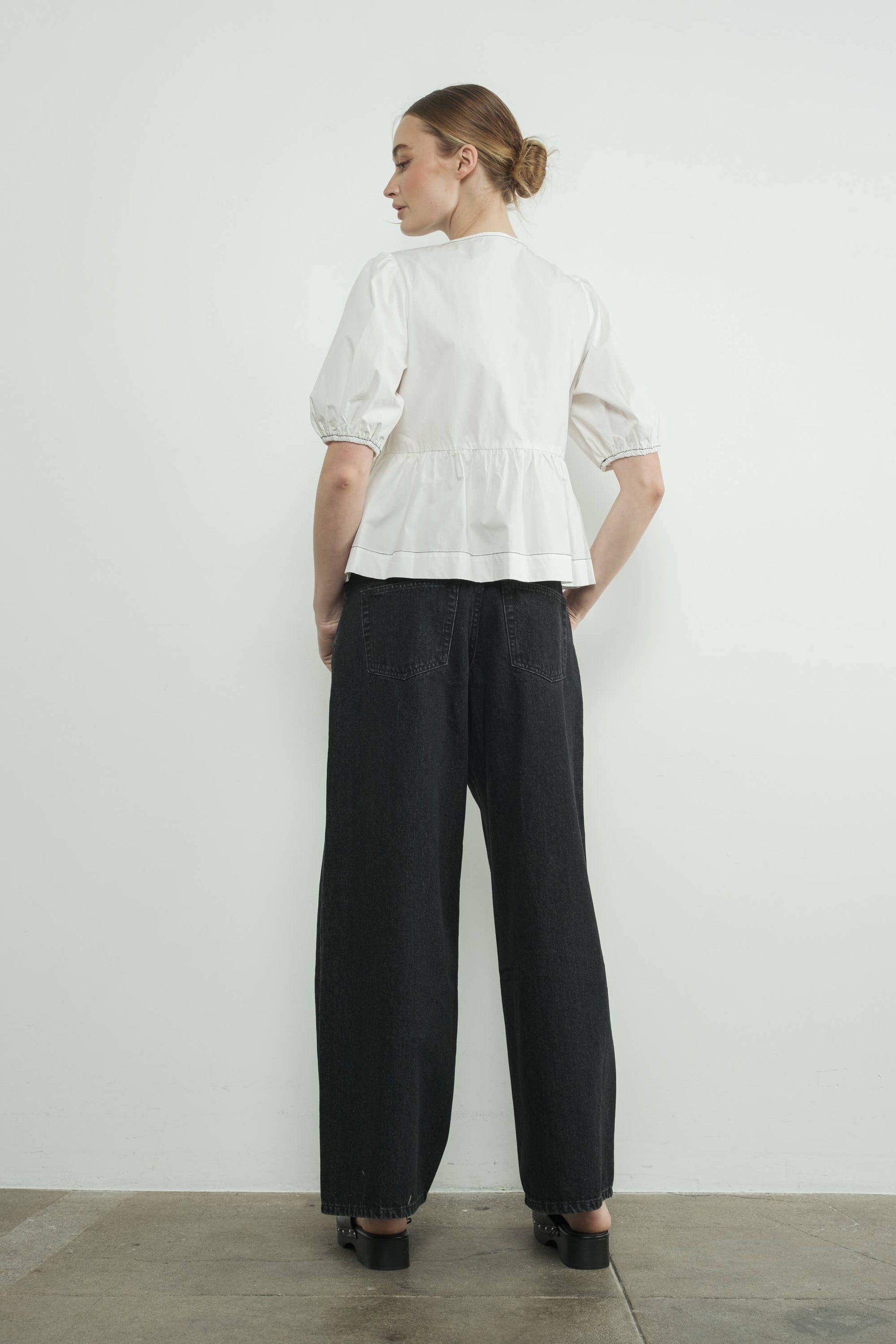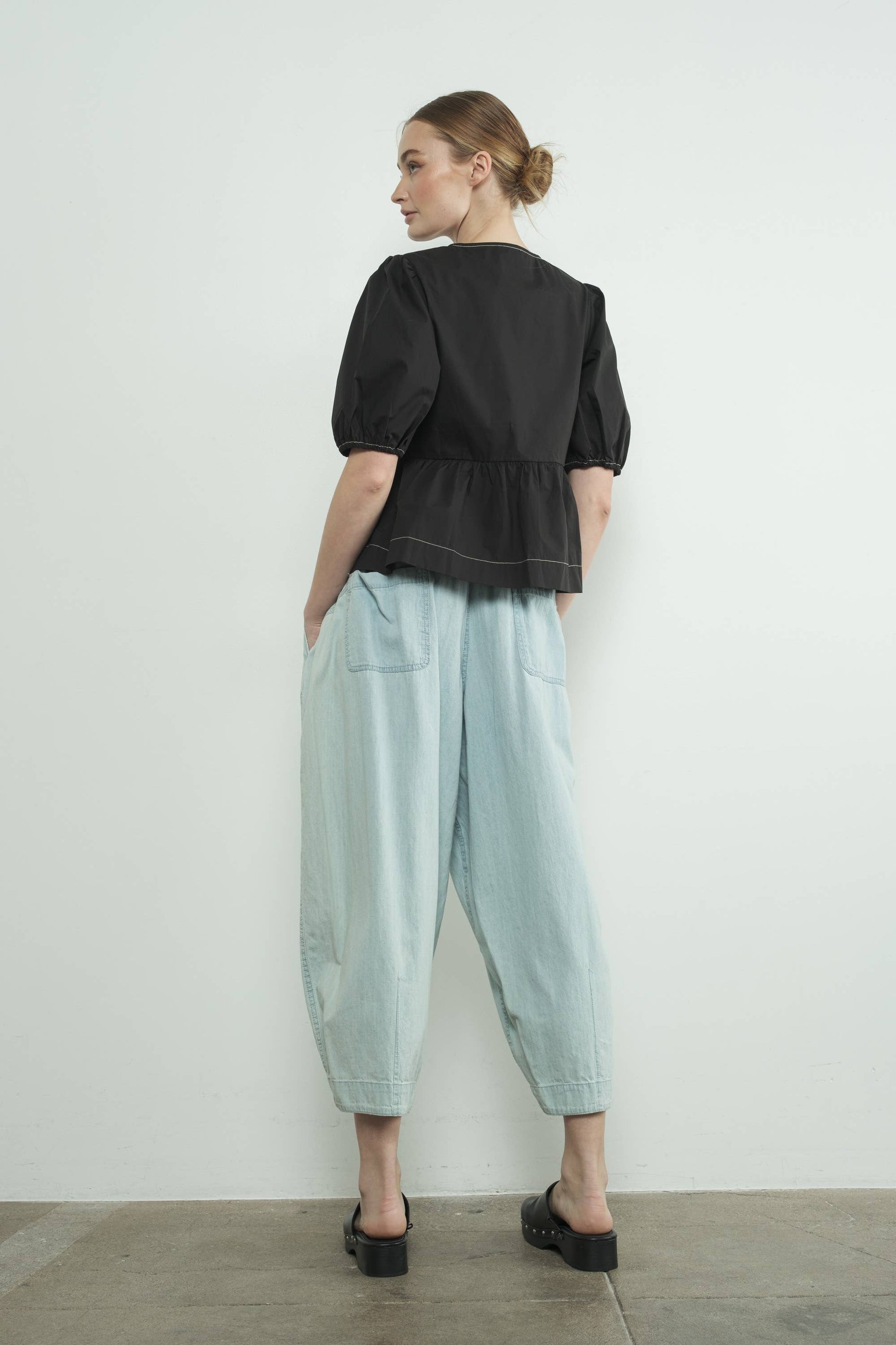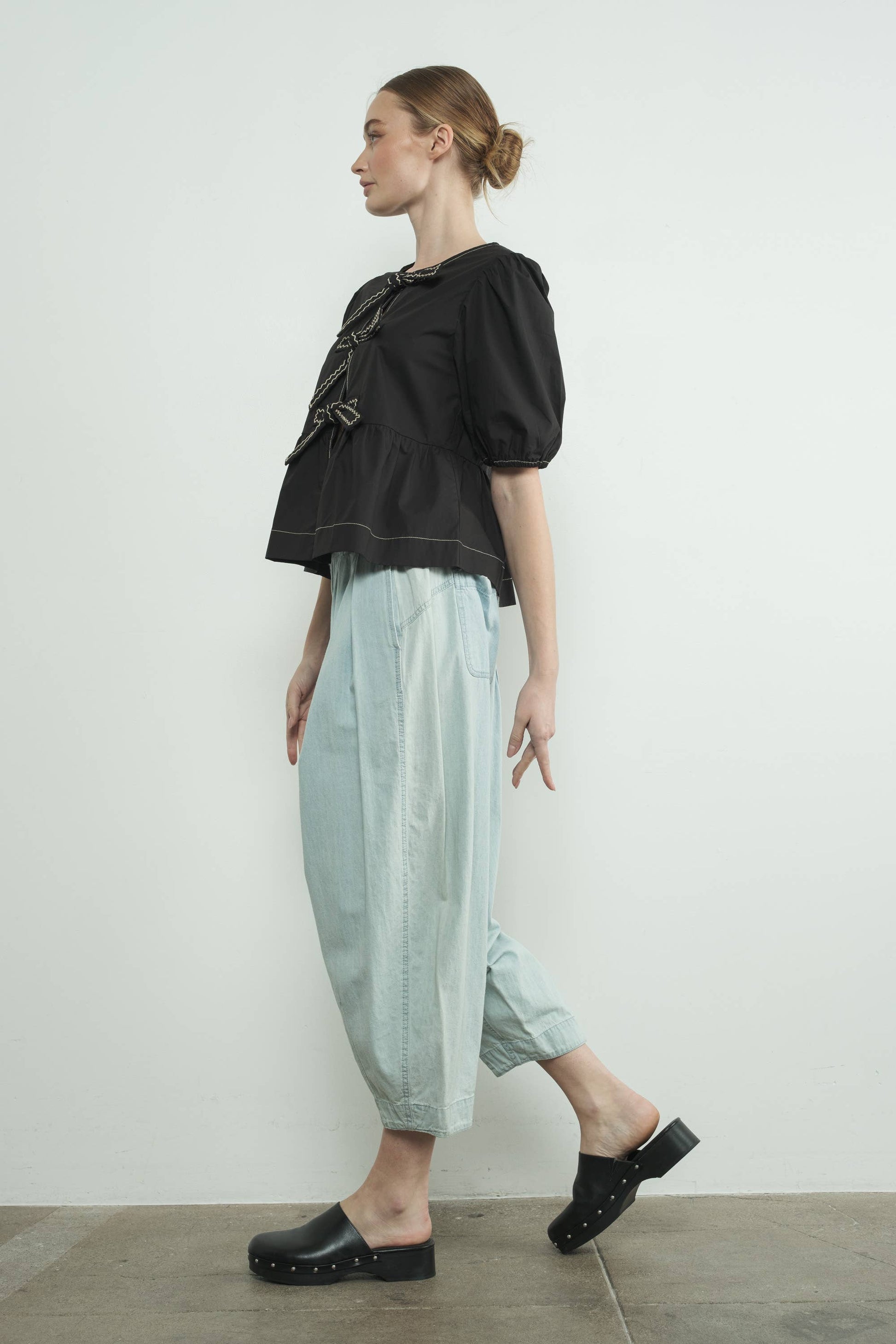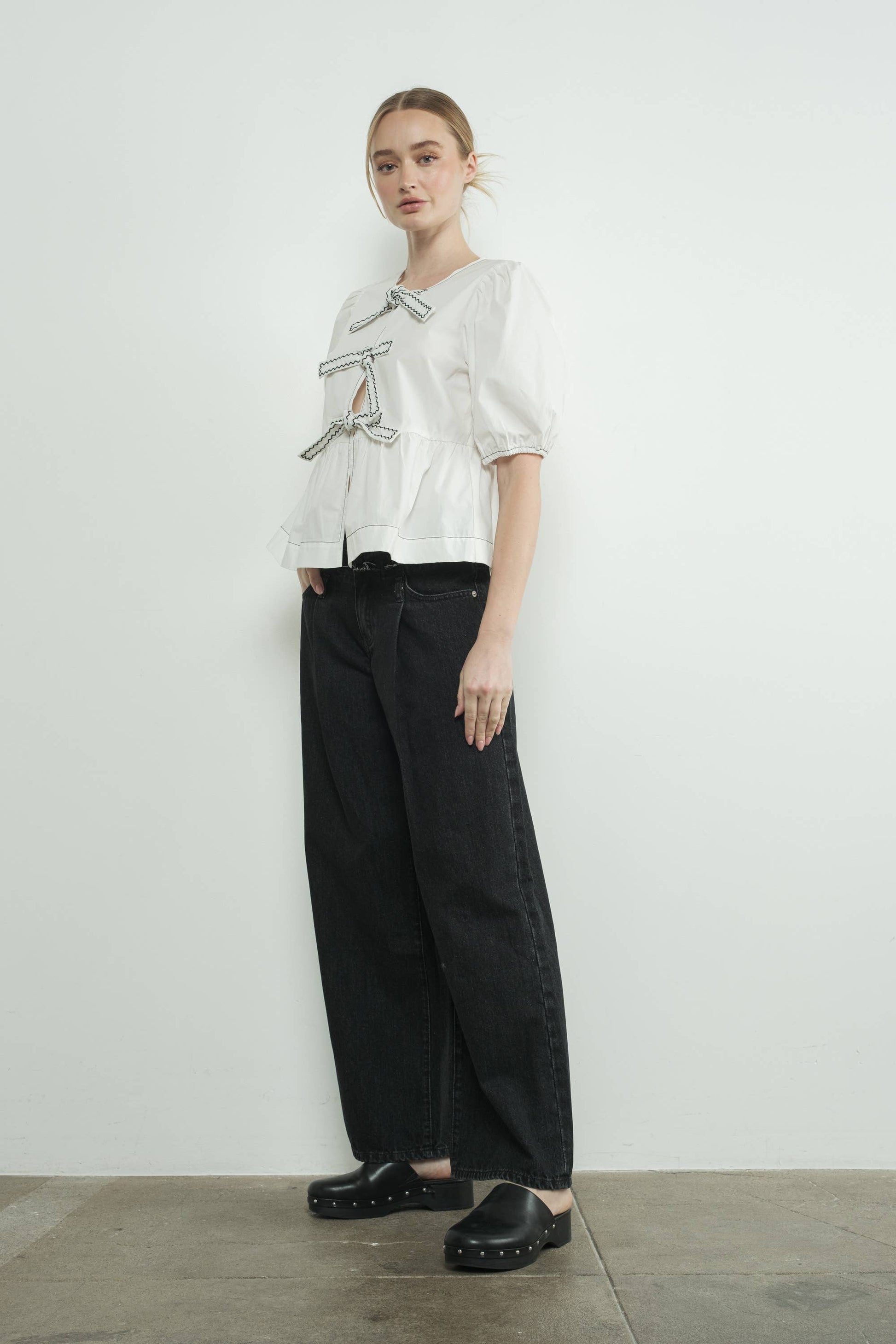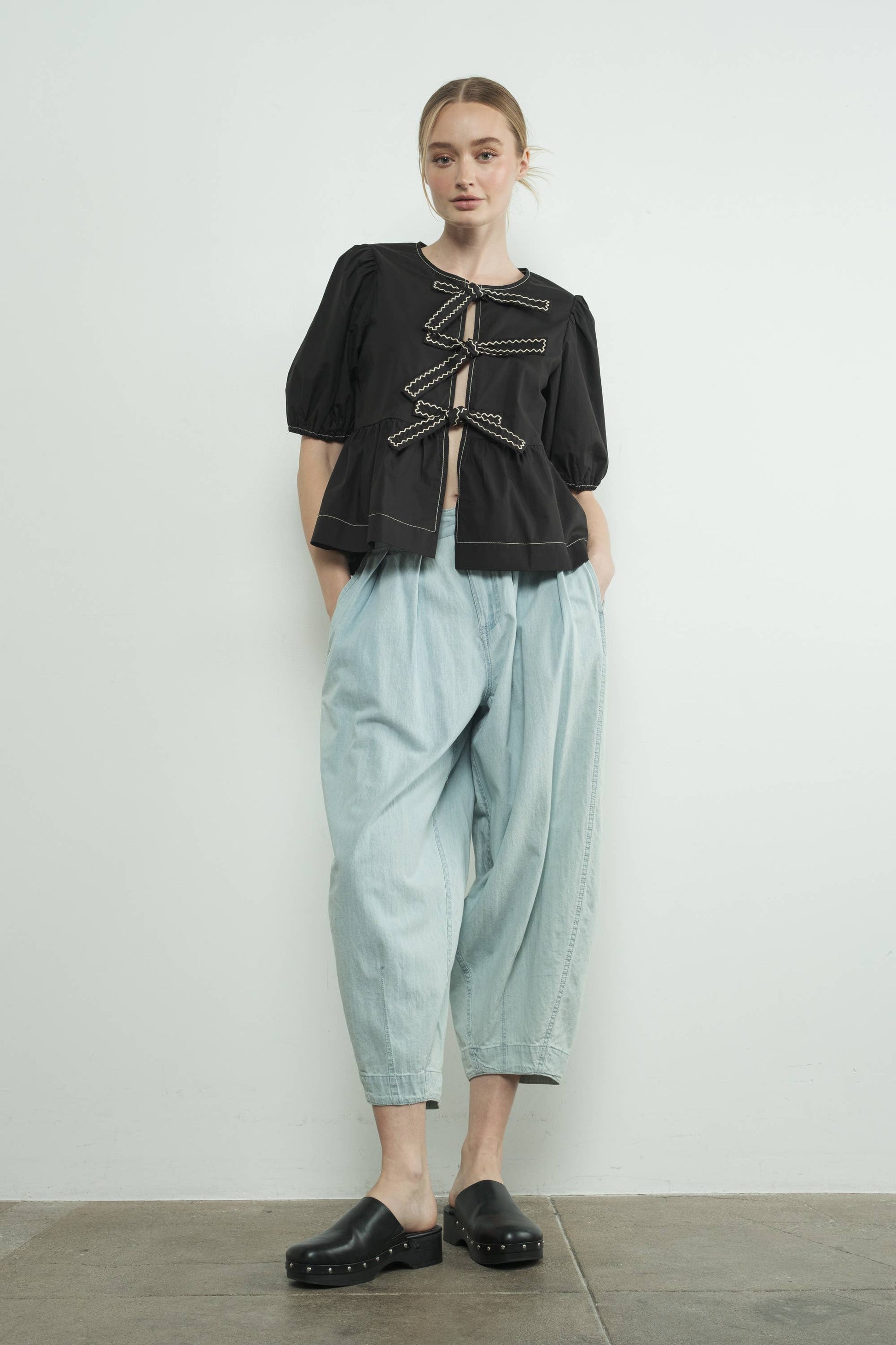 MAT3114 EMBROIDERED BOW TIE PEPLUM BLOUSE