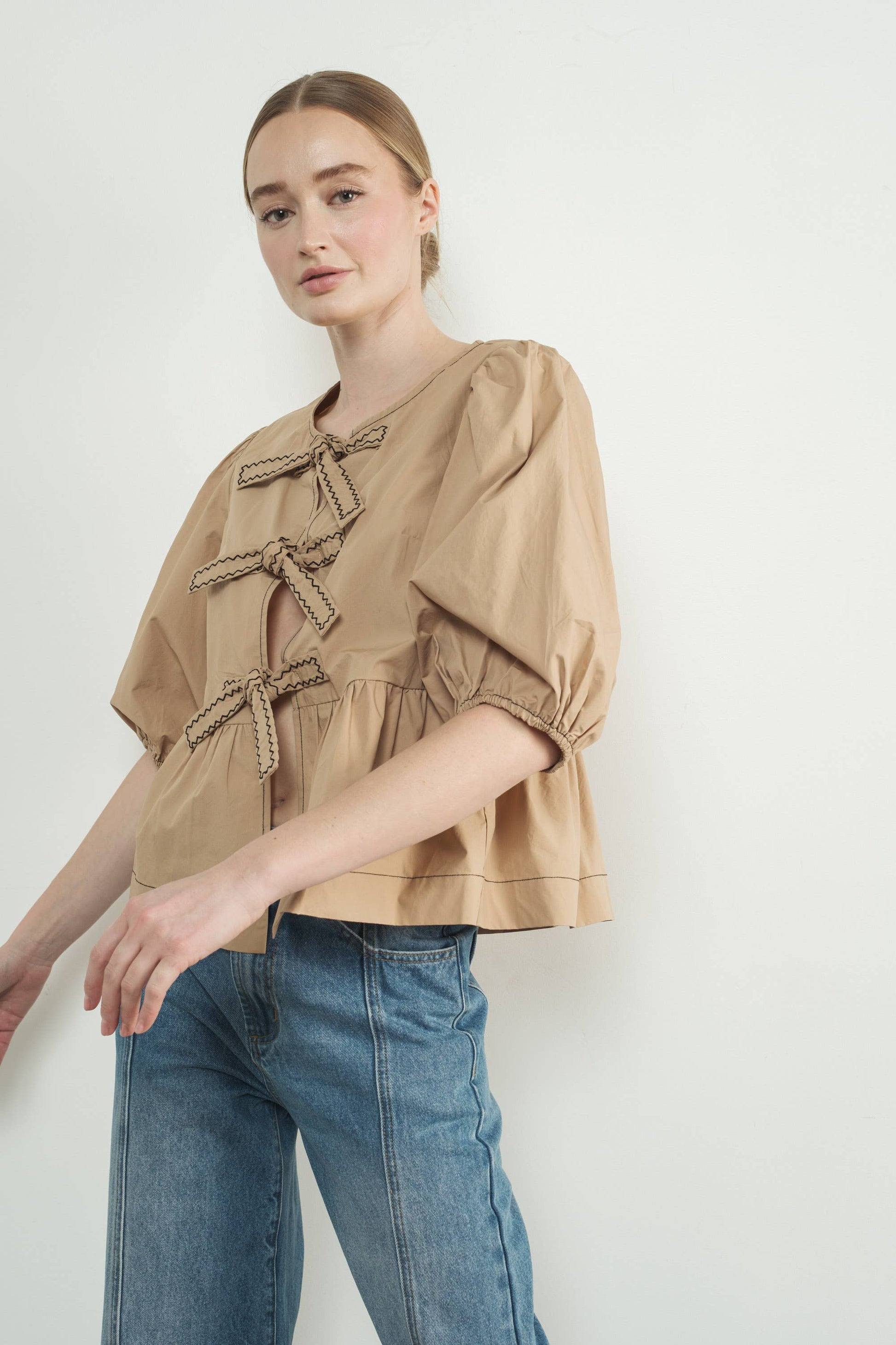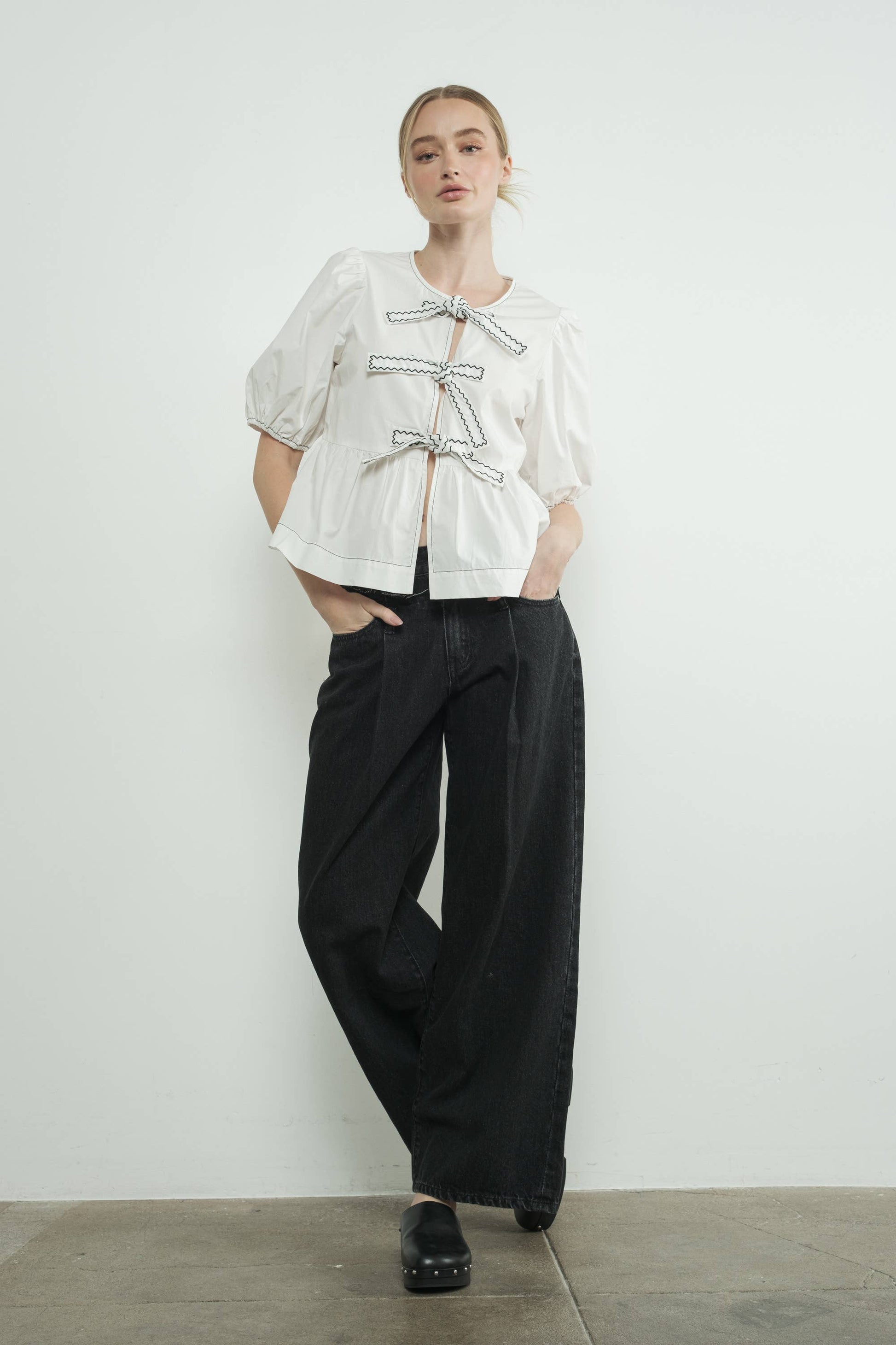 This embroidered bow Tie Blouse is made from cotton. This blouse has a emboroidery front bow tie. The blouse is designed for a relaxed fit and features an open round neckline with tie closures and signature puff sleeves with elastic edges. The bow tie closures make the look special.